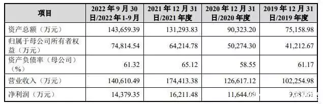 财务方面,于2019年、2020年、2021年及2022年1-9月,公司实现营业收入分别约为10.23亿元、12.66亿元、17.44亿元及14.06亿元人民币;同期,净利润分别约为9087.61万元、1.16亿元、1.62亿元、及1.44亿元人民币。