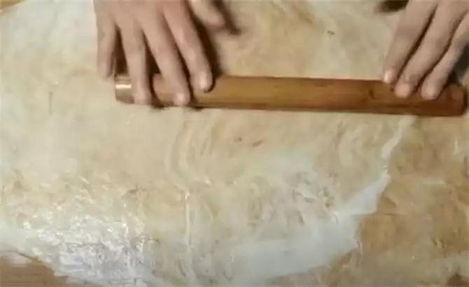 5.饧好之后,再次用擀面杖擀成饼皮。
