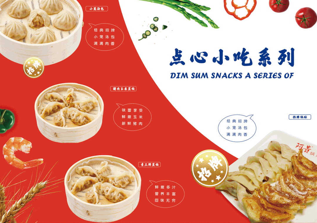 阿贵锅贴整体的设计色调为橙红和原木色设计,加入了拟人化的品牌IP形象元素,将产品形象化、立体化,形成视觉,味觉,听觉的三重感官交互体验。