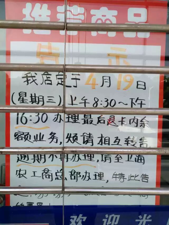 公告说明,农工商于4月19日(本周三),8:30~16:30办理最后退卡内余额业务,逾期的话只能到上海农工商总部办理退卡。小马君提醒,手上还有农工商卡的小伙伴抓紧时间办理退卡业务!在超市商品全部售完后,农工商将彻底撤离马鞍山!