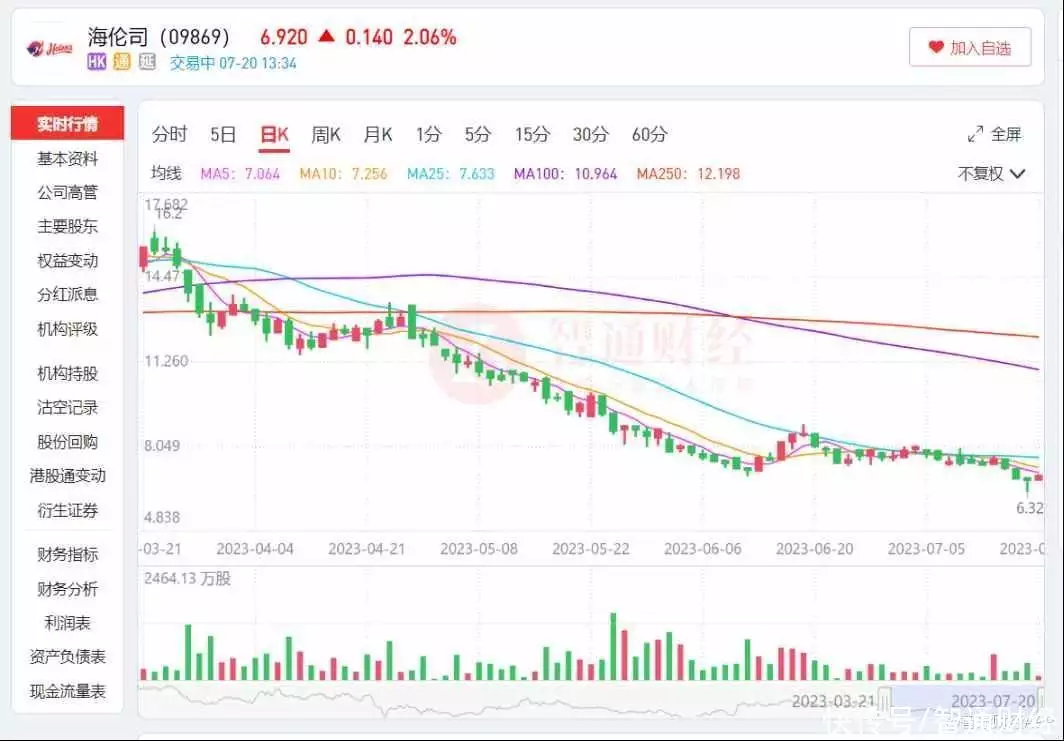 原因无他,海伦司的股价,在7月19日盘中,再度创出上市新低的6.32港元,较历史高点25.75港元跌去75.5%。最近一段时间里,海伦司的股价于6月下跌11.97%,7月最大跌幅达到17.39%。