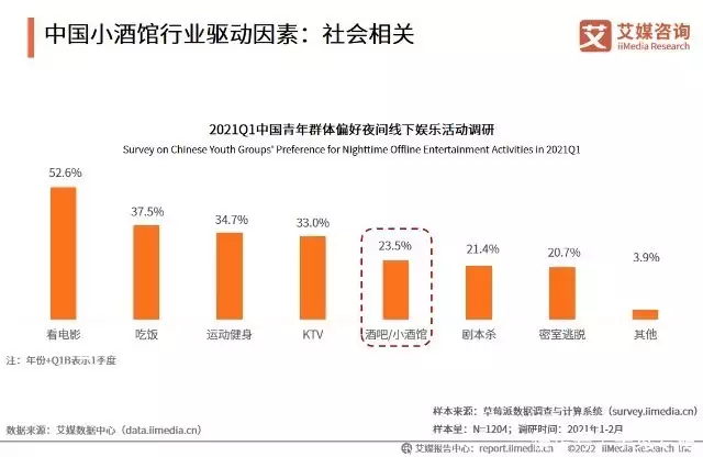 据艾媒咨询数据显示,中国青年群体是夜间经济消费较为活跃的主体,选择在夜间去小酒馆的青年群体达到了23.5%。青年群体夜间外出饮酒需求显现,为小酒馆业态增长带来可能。