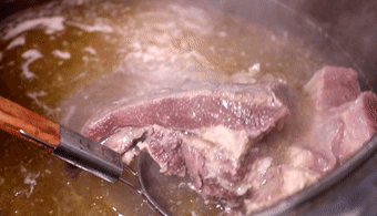 首先将将牛筋骨放到大锅中熬制,由于筋骨中含有大量的骨髓,骨髓经过慢慢熬制,会形成牛的骨油,混合到汤里面,大大增加了汤的骨香味。再使用温火慢慢煮两三个小时