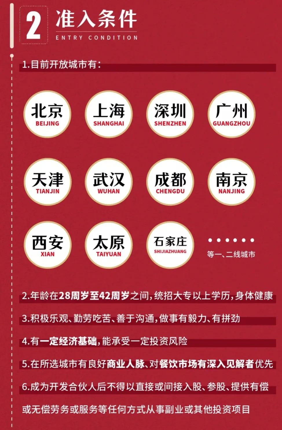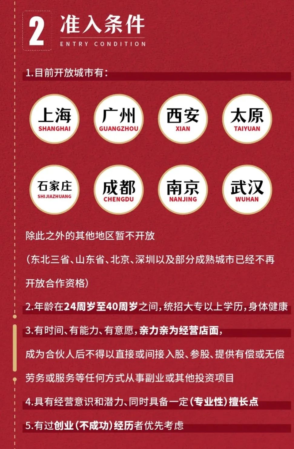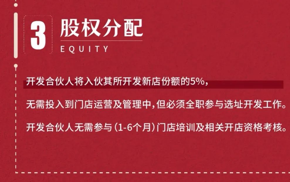 1开放的城市才做门店合伙人。2年龄24-40周岁,大专以上。3:需要本人投入全职管理,非投资合伙人其中第3点非常重要,不是纯投资人,不是甩手掌柜,而是要参与经营和管理的。入股的比例分为4个级别:8%、16%、24%、32%。比例是由以下条件决定的:1在规定培训期(1-6个月)通过开店资格考核,能力得到验证。2专业能力在组织内部的决策与贡献程度。3启动资金开发合伙人是针对有开发选址特长的人进行的一种合作方式,不需要参与门店运营,但是必须要全职参与选址开发的工作。具备条件:1:开放的城市才做门店合伙人。2:年龄28-42周岁,大专以上。3:需要本人全职参与选址,非投资合伙人。4:有良好商业人脉、对餐饮行业有深入了解优先股权分配方面,开发合伙人可以入伙自己开发新门店中的5%份额。