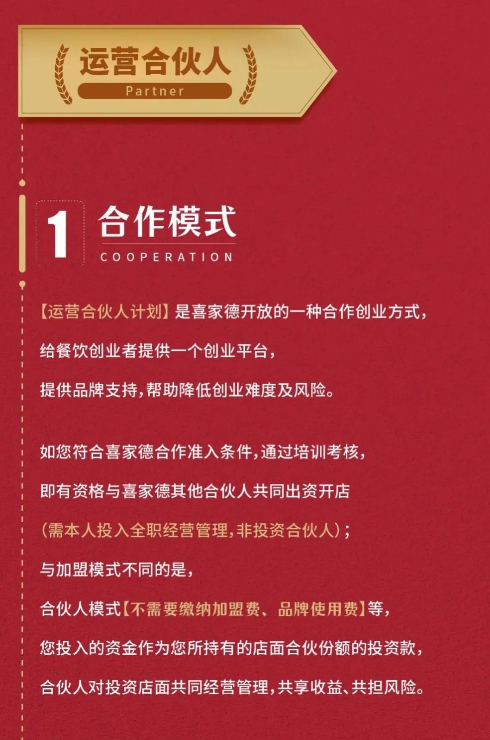 2021年9月2日,喜家德年度共发布了两种合作创业模式:1、运营合伙人计划2、开发合伙人计划【运营合伙人】是喜家德开放的一种合伙创业方式,也就是说喜家德给餐饮创业者提供创业平台,提供品牌支持。与加盟模式不同的是,不需要交加盟费和品牌使用费,投入的资金是作为店面合伙的投资款,大家一起共同经营,共享收益、共担风险。