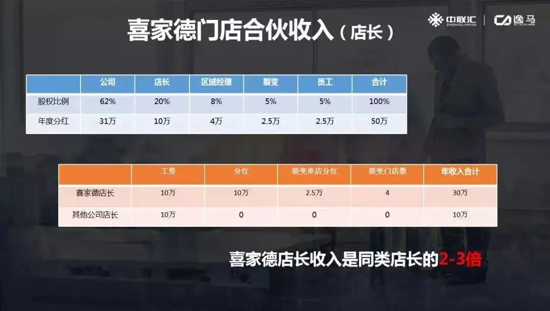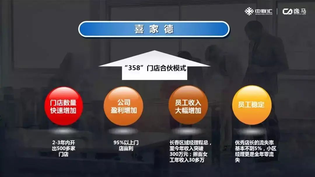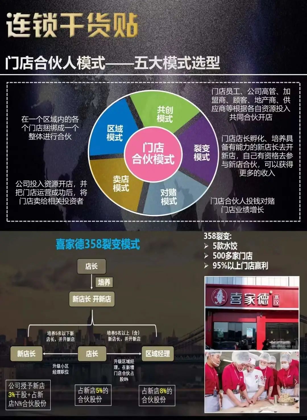 喜家德“358模式”其实很多行业都可以复制,他的这个模式本来就是非常灵活的。可以在自己的企业弄一个如247模式或者369模式,最主要的是要要算出3%是多少钱,能不能跟员工的综合收入能不能产生激励的作用。喜家德“358模式”背后的核心就是对人才足够重视,随着发展的需要,每个企业都需要一批有学习能力、有解决问题能力的人才来打市场。像喜家德的这种方式就能极大地调动了店长培养人的积极性。并且店长与新店长之间,利益相关,沟通成本极低。真正地完成了内部自生长机制的转型。对外,喜家德为了能够拓展全国市场,只要能够达到喜家德的标准,喜家德提供统一的支持和帮助,然后就可以和喜家德共同出资经营新店。不需要缴纳加盟费、品牌使用费等费用,与公司共同出资,共同经营,共享收益,共担风险。这就是喜家德的“合伙人模式”小结:首先需要本人亲力亲为来管理店面,原则上是谁投资谁管理,不能从事第二职业、兼职或其他生意项目。然后开店城市与区域由喜家德每年统一做战略规划,合伙人需要能跟随喜家德一起开发进入新城市。合伙人可占股比例8%、16%、24%和32%,主要根据个人申请意向以及考核结果确定合伙份额,不同占股比例分别有以下要求:8%:6个月之内考取店长资格证16%:3个月之内考取店长资格证24%:2个月之内考取店长资格证32%:1个月之内考取店长资格证你考的资格证越早,占的股份就越多,所以这种模式就会避免你什么也不懂就去加盟,而是跟你一起开店,收益共赢、风险共担。所以说我们要把一个企业做成平台,链接员工,最终就是让我们这个企业凝聚一伙跟我们一起干事业的人,而不是单纯的领死工资。这样员工可以收益,平台也可以收益,大家一起把这个平台做大做强。