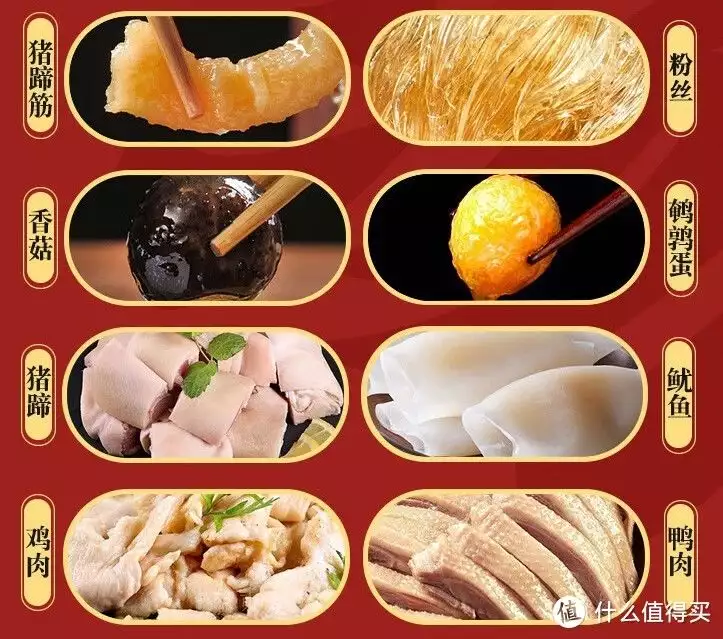 佛跳墙,起源于清代,传承至今已有数百年的历史。它汇集了山珍海味,被誉为“闽菜之首”,富含营养价值,具有健脾开胃、滋阴补肾、活血化瘀等多种功效。那就让我们就来看看这款佛跳墙里面都有啥好食材吧。主材有土耳其参、南日鲍和瑶柱,辅材就更多了,有猪蹄筋、香菇、猪蹄、鸡肉、粉丝、鹌鹑蛋、鱿鱼和鸭肉。采用非遗原汤,经过两遍熬制而成,让您品尝到最地道的佛跳墙美味。