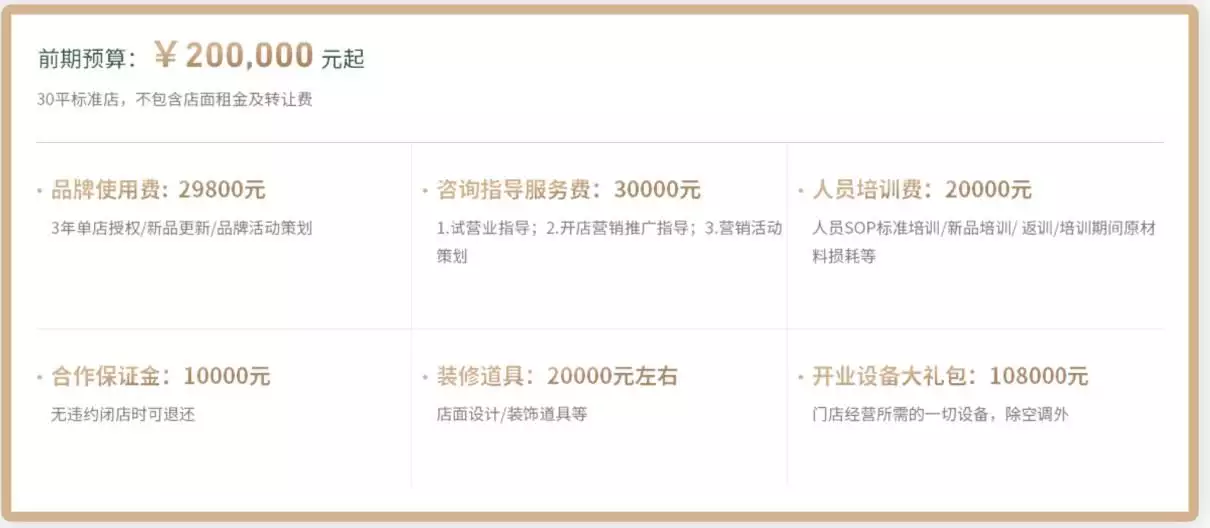 至于加盟费用,具体包括品牌使用费、咨询指导服务费、人员培训费、合作保证金等。以30平米的标准店为例,在不包含店面租金及转让费的情况下,前期预算至少得20万元。