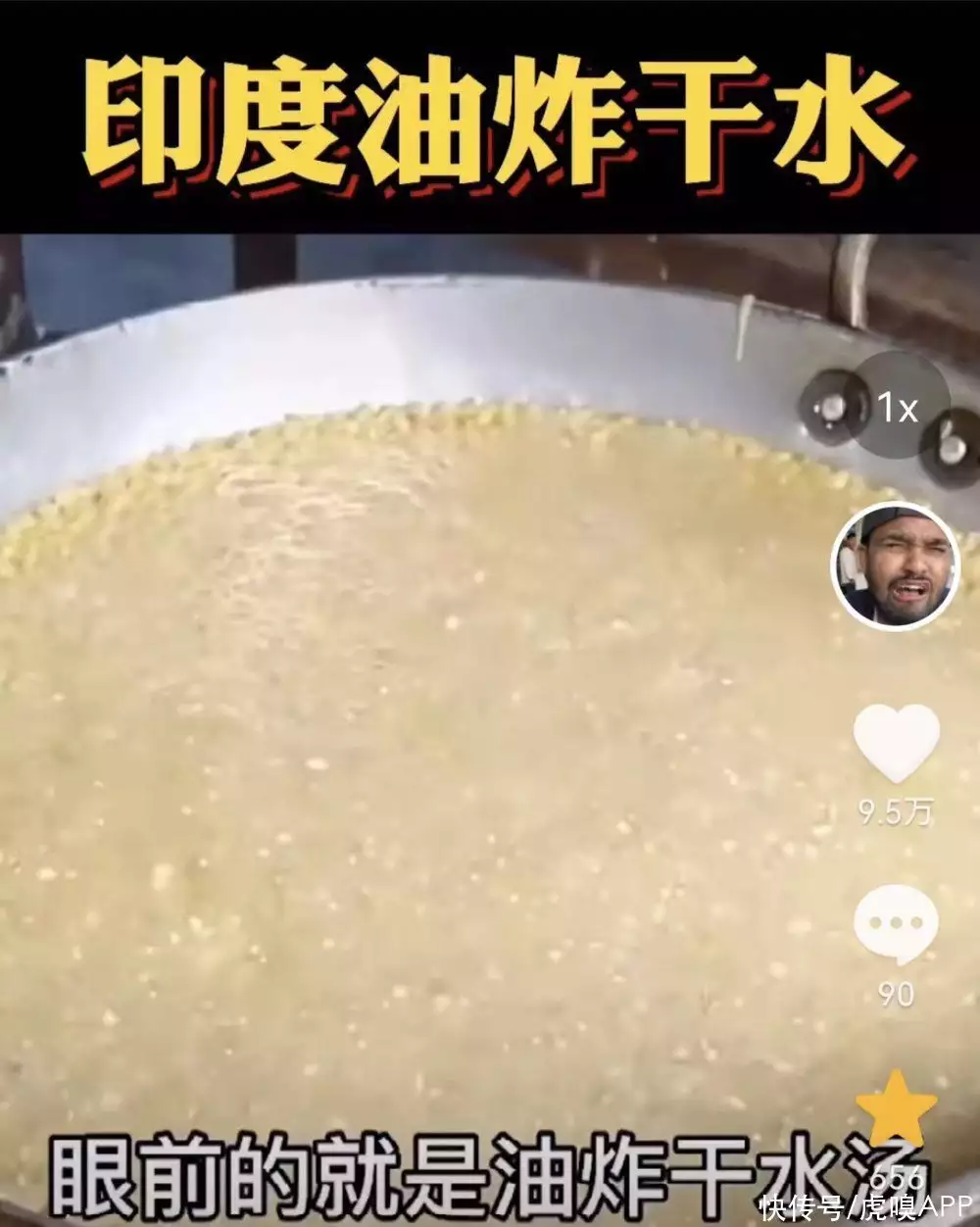 一段油炸面糊的视频,解说号配文道:“这是印度的油炸泔水汤,印度人饿极了,鸡蛋皮都能给你炸了……炸完了捞出放入新鲜的牛水当中。”