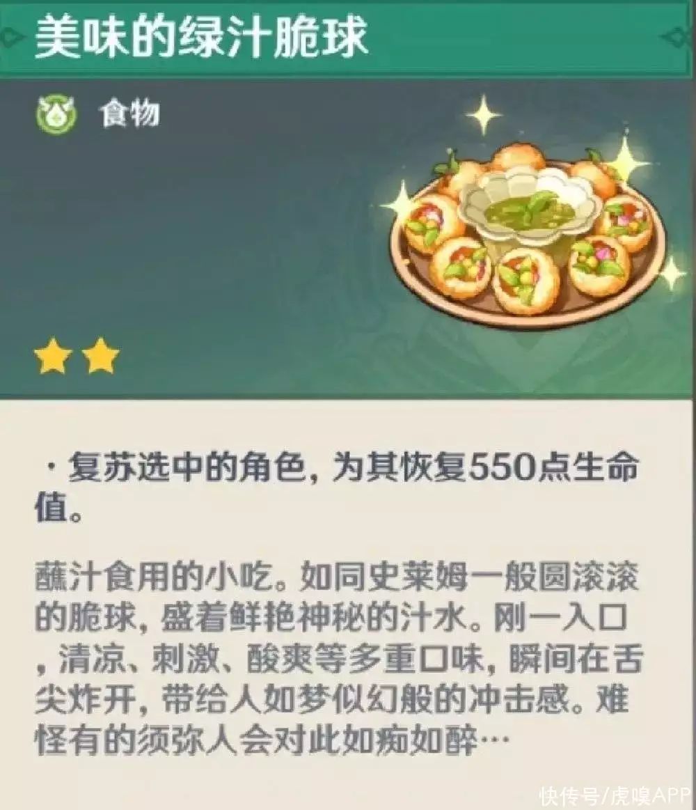 就连虚拟世界也不能免俗,游戏《原神》就有“绿汁脆球”做为须弥国的特产美食,根据描述,吃了可以补充生命值。