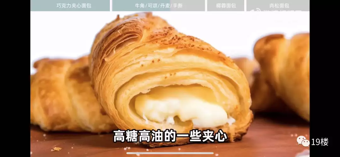 超市里的这类面包,品名一般叫牛角包、手撕面包、起酥面包、酥皮面包之类的,不过一般舍不得用黄油,而是植物油代替。为了让价格低廉的植物油也起到类似黄油的效果,大多需要经过氢化等工艺的处理,虽然现在厂家都很注意降低反式脂肪酸产生了,但成品也会包含大量饱和脂肪,还是不健康。