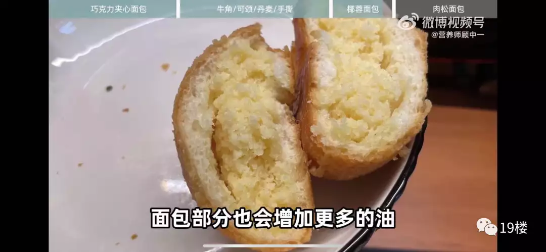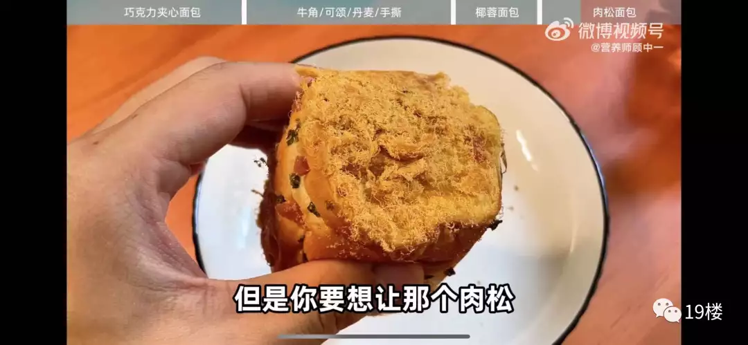 第四类,肉松面包。市面上的肉松主要是用肉粉和豆粉进行配比的产品,蛋白质含量还是比较高的。但是,要让肉松粉牢牢黏附在面包表面,并营造出和谐的口味,无论面包坊还是超市卖的肉松面包,都免不了要添加大量的沙拉酱或者奶黄酱。