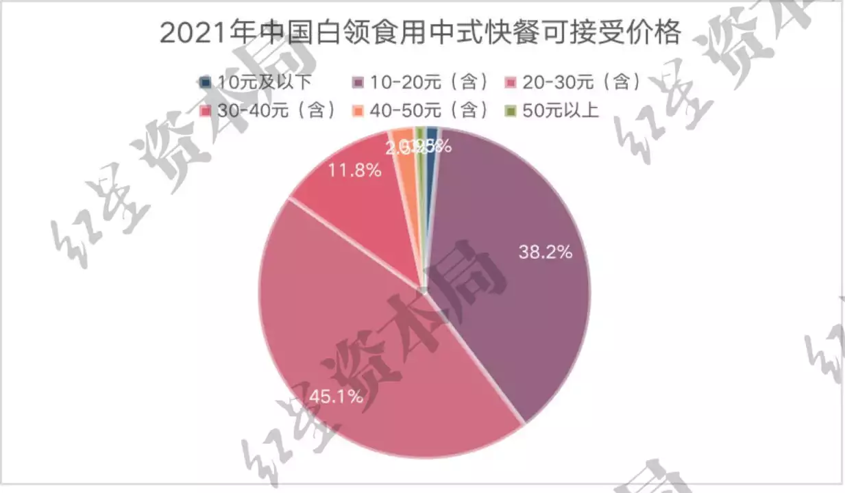 根据艾媒咨询发布的《2022年中国餐饮行业发展现状及市场调研分析报告》数据,在2021年中国白领群体食用中式快餐可接受价格中,45.1%的受访者选择20-30元(含30元),38.2%的受访者选择10-20元(含20元)。