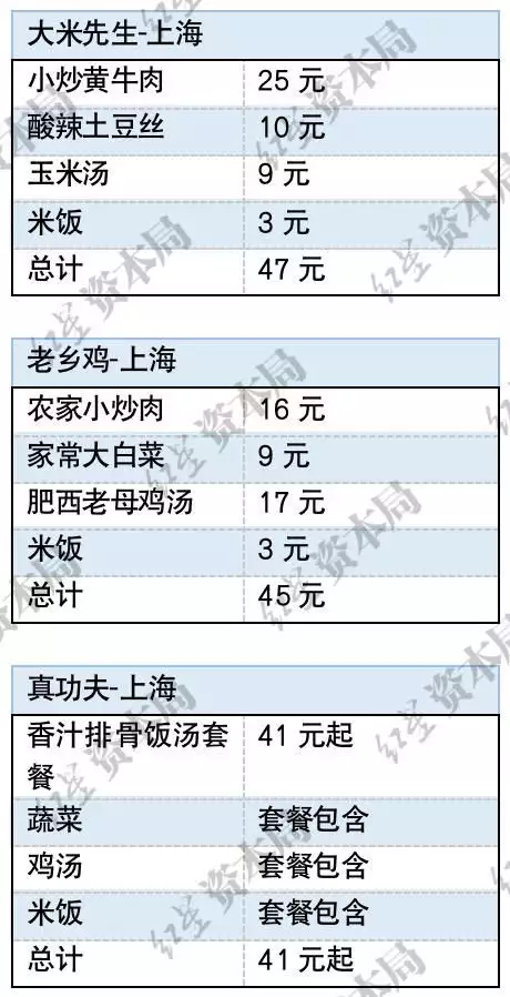 由于不同的地区,经济发展水平有差异,红星资本局主要选取上海与成都两地热门中式快餐品牌,按照一人一荤一素一汤的标准进行测算。