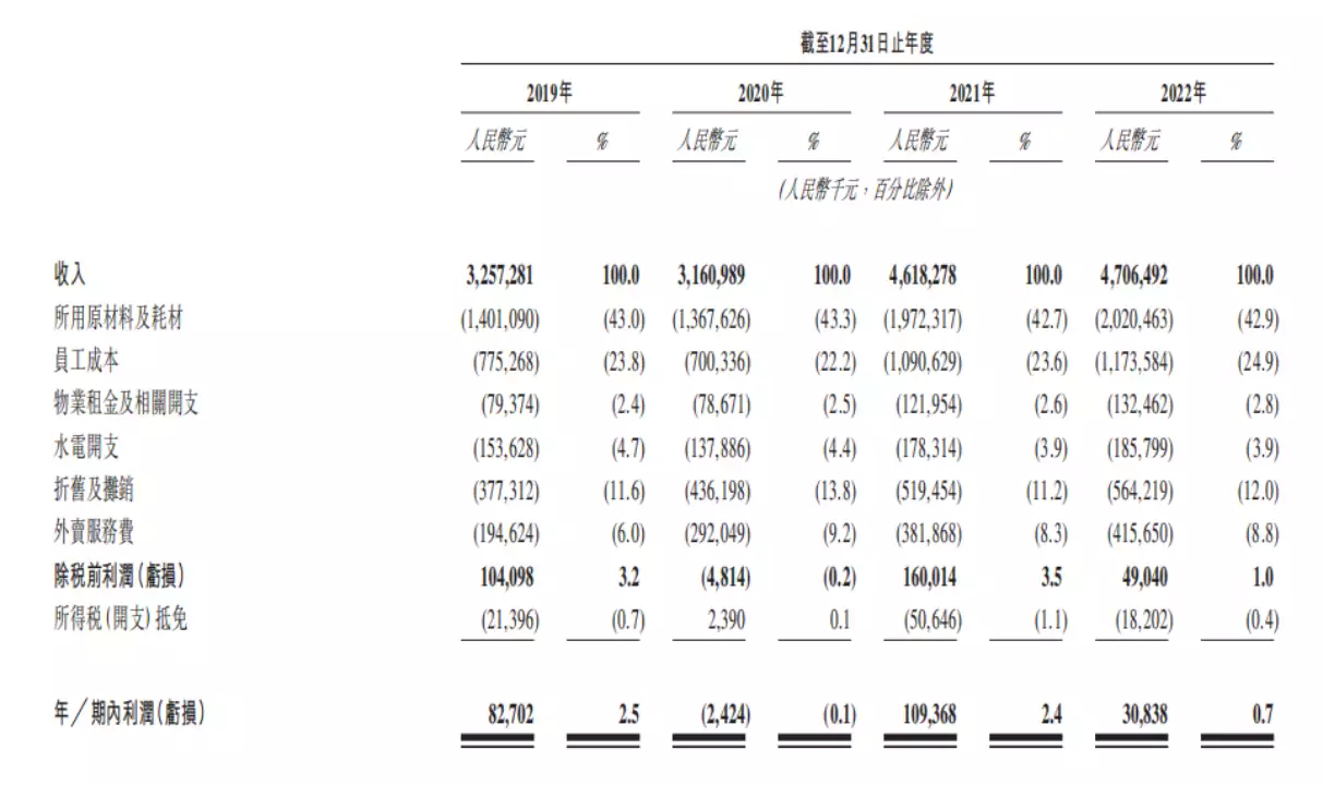 从乡村基的成本端来看,招股书显示,2019年至2022年,乡村基以上三项成本开支均呈增长趋势。2022年,其所用原材料及耗材、员工成本、物业租金及相关开支分别为20.2亿元、11.74亿元和1.32亿元,占同期收入的比重分别达42.9%、24.9%和2.8%。