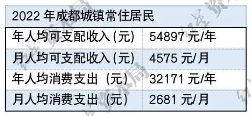 根据成都市统计局数据,2022年成都城镇常住居民的人均可支配收入为54897元,平均每月为4575元。
