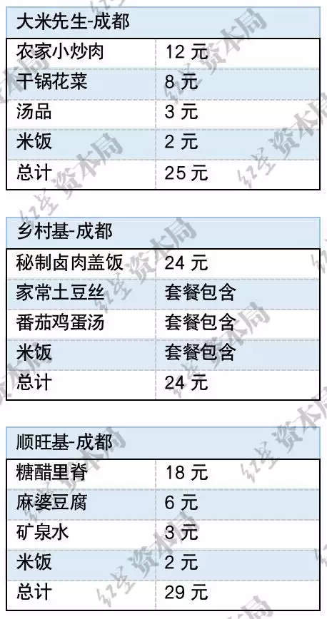 在成都,红星资本局选取了大米先生、乡村基、顺旺基三家中式快餐头部品牌的热门菜品测算。