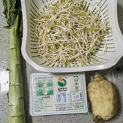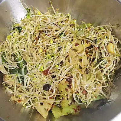 14、然后把豆芽和莴笋叶捞出大盆里。