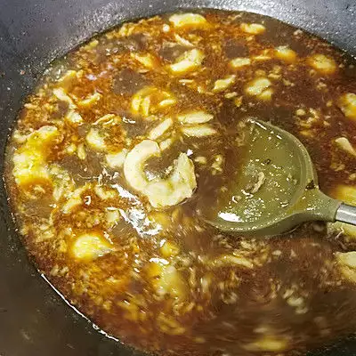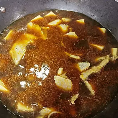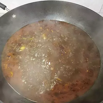 10、然后放入热开水,放入料酒、酱油、蚝油、盐调味。