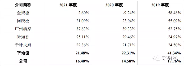 另外,与已上市的同行比较,老娘舅的多项业绩指标也明显低于同行。2019-2021年,老娘舅综合毛利率分别为17.76%、14.58%和 16.40%,而同行业可比公司毛利率平均值为41.34%、22.31%及21.48%。