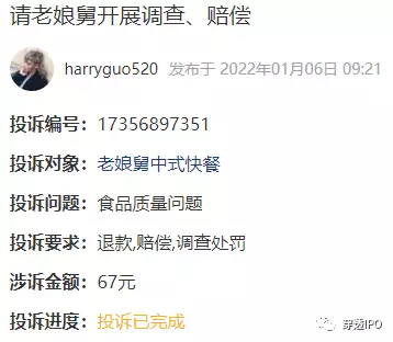 而除了多次被处罚外,老娘舅也曾多次被投诉。编号为17356897351消费者在黑猫投诉表示,“2022年1月3日12时49分,一家人在南京市珠江路金鹰天地店地下美食广场老娘舅点了两份套餐,其中梅干菜烧肉套餐中炖鸡蛋被幼子以及妻子共同食用完。当日下午15点,1周岁的幼子开始在车上出现呕吐情况,当日夜间开始拉肚子,次日上午稍有好转,下午17点30左右开始出现发烧(39℃);5日凌晨3点30分左右,4周岁幼子睡梦中突然出现呕吐现象2次,5日当晚约20点,妻子开始出现剧烈呕吐6次,拉肚子8次,带至江苏省中医院江北院区诊断治疗,诊断结果为急性肠胃炎。”