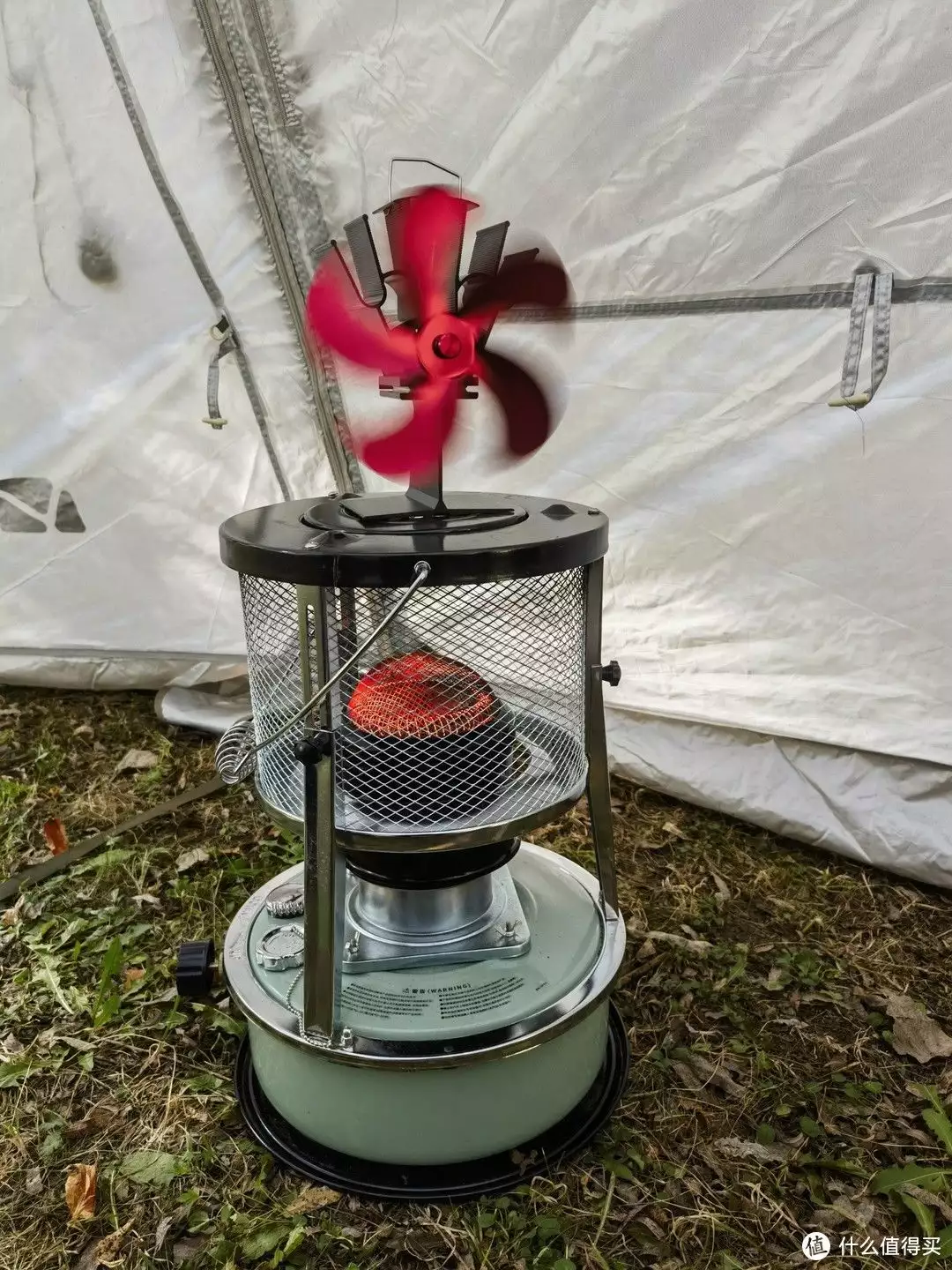唉,北方真的需要取暖了,即使是下午,毕竟最高气温只有16度…藤次郎r95,最便宜的煤油取暖炉了,缺点刚点燃的时候味道大一些,过一会也还好,用的溶液贵一些,取暖效果还不错,和柴火炉比不了,但也能改善帐篷内温度。搭配了热能风扇,转啊转,好像也没有明显热风,但应该能把部分向上的热能利用一下吧…