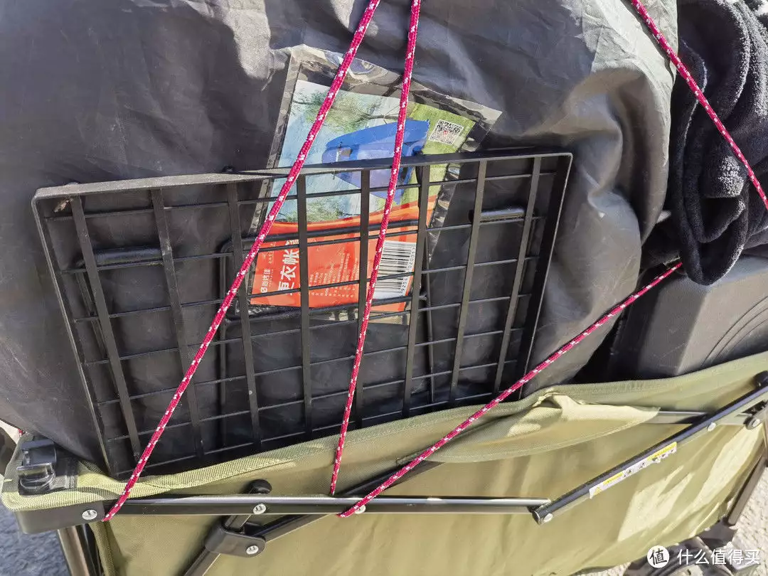 在不倒的情况下,把装备尽可能的堆高高,发挥露营车最大的装载能力,这次出门,车前面竖立宅宅椅和蛋卷桌,后面车底先平铺4把牧高笛月亮椅,然后上面放上揽胜3(超级大),两侧放上铁网桌,增加车子高度,上面再摆上铝合金收纳箱,箱子上面放上装冷冻食材的外卖箱,缝隙放厕所帐篷,充气床垫,宅宅椅上挂上儿童睡袋,女儿的玩具袋…最后用10米晾衣绳缠几圈进行固定!