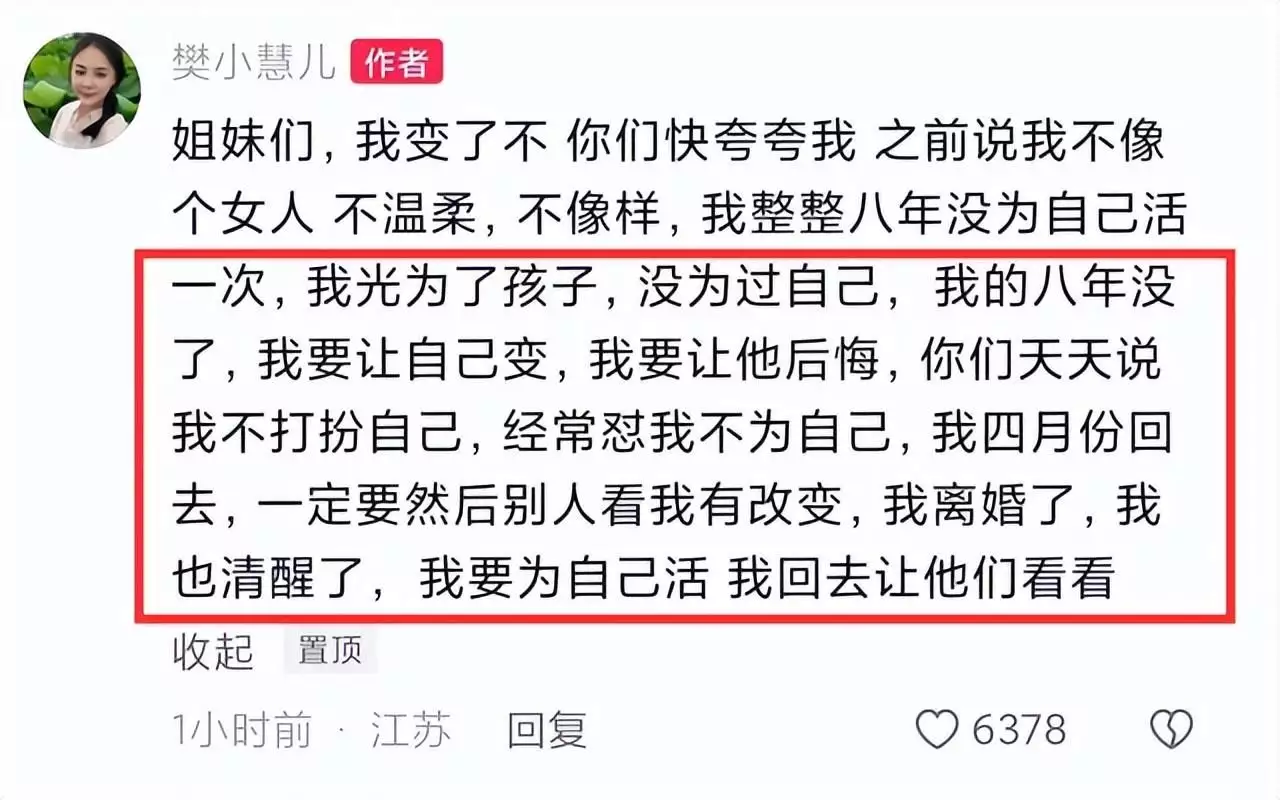 3个月前,樊小慧表示已经正式离婚,前夫也被单位处分,她要一个人带着孩子,好好生活。