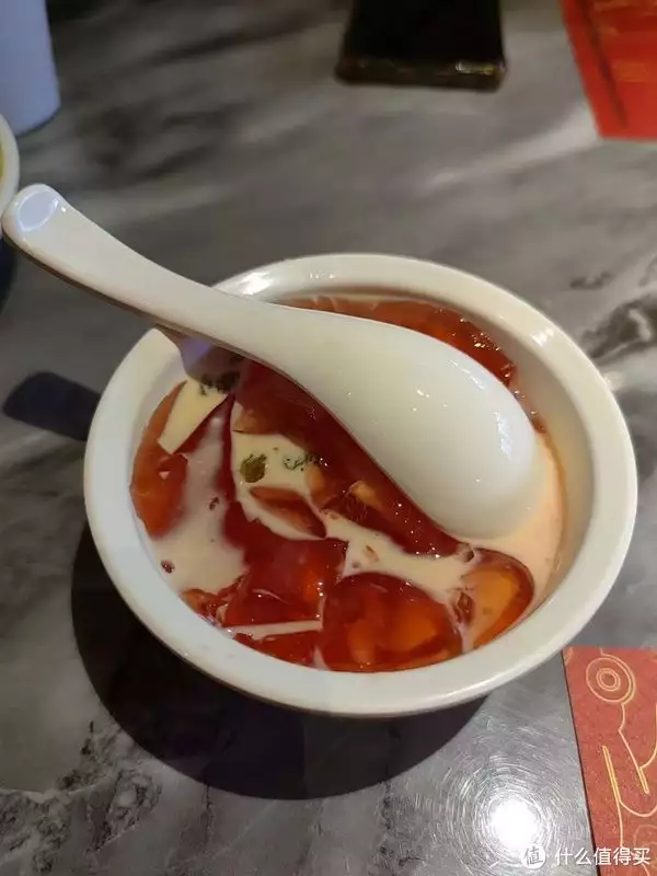 然后当我跟妈妈推介了芝士泡菜味后,妈妈跟我说,她不喜欢芝士味,然后我把餐牌给她看,让她自己点,她点了一个不辣的最普通的做法,姜爆香葱味,当服务员端上来的时候,发觉上面的葱还是有点生生的,牛蛙肉也是淡淡的,没有什么味道,但是当10分钟后,锅烧开了.那些葱头熟了点,牛蛙肉吸收汤汁之后,开始变得非常滋味,老妈也说味道还可以,然后我继续点了个金沙咸蛋黄牛蛙,最近的美食都是很喜欢用咸蛋黄沙来炸东西,不过这味菜老妈说太一般,里面的肉湿湿的,口感不怎么行,剩下的都叫我吃光它。最后在它家吃饭,注册个会员有免费的甜品凉粉吃,这个比较清淡,味道还可以。
