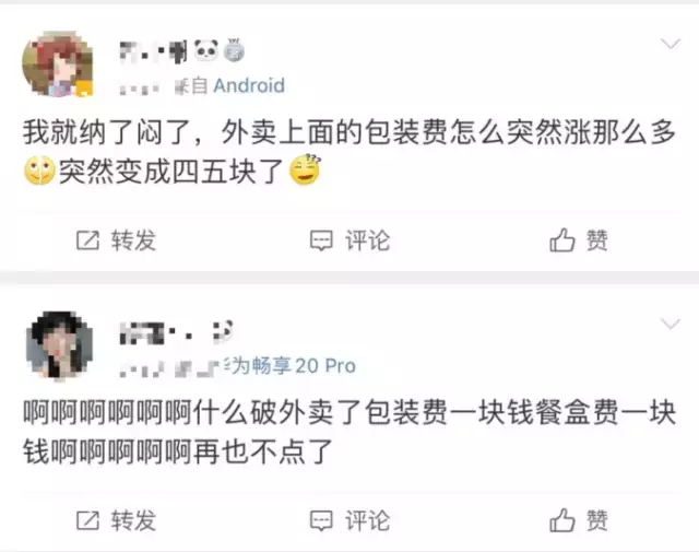 据工人日报报道,3月29日,辽宁沈阳消费者张女士反映,她当天通过外卖平台在某热销奶茶店总店买了一杯奶茶,发现被商家收取了打包费。“一份13、14元的奶茶,打包费竟要4元,而且送来后那杯奶茶外面就只有一个塑料袋。”针对张女士提出不该收取这么多包装费的问题,奶茶店工作人员解释说:“你也看到了,我们有5元店铺立减券,平台还要抽取一部分佣金,不收打包费就亏了。”3月29日,上海电视台《新闻透视》栏目也报道了一个“18块的麻辣烫外卖,包装要6块”的案例。