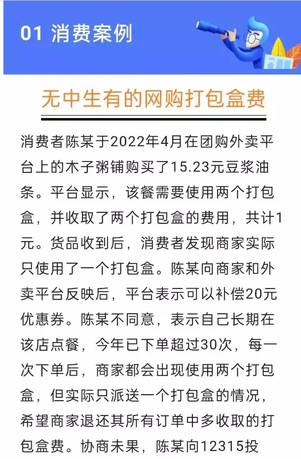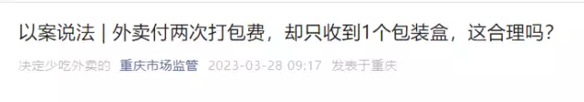 3月28日,重庆市市场监督管理局发布了一个案例。案例中,消费者交了两个打包盒的费用,却只收到一个。