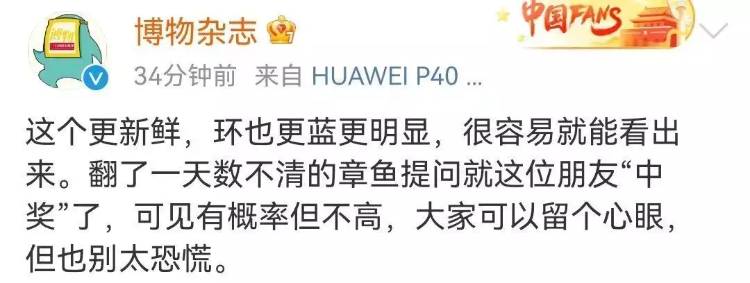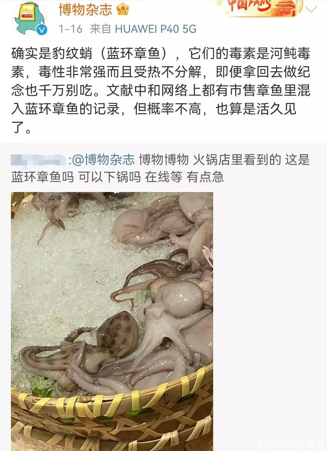 @博物杂志 回复显示:“确实是豹纹蛸(蓝环章鱼),它们的毒素是河鲀毒素,毒性非常强而且受热不分解,即便拿回去做纪念也千万别吃。文献中和网络上都有市售章鱼里混入蓝环章鱼的记录,但概率不高,也算是活久见了。”