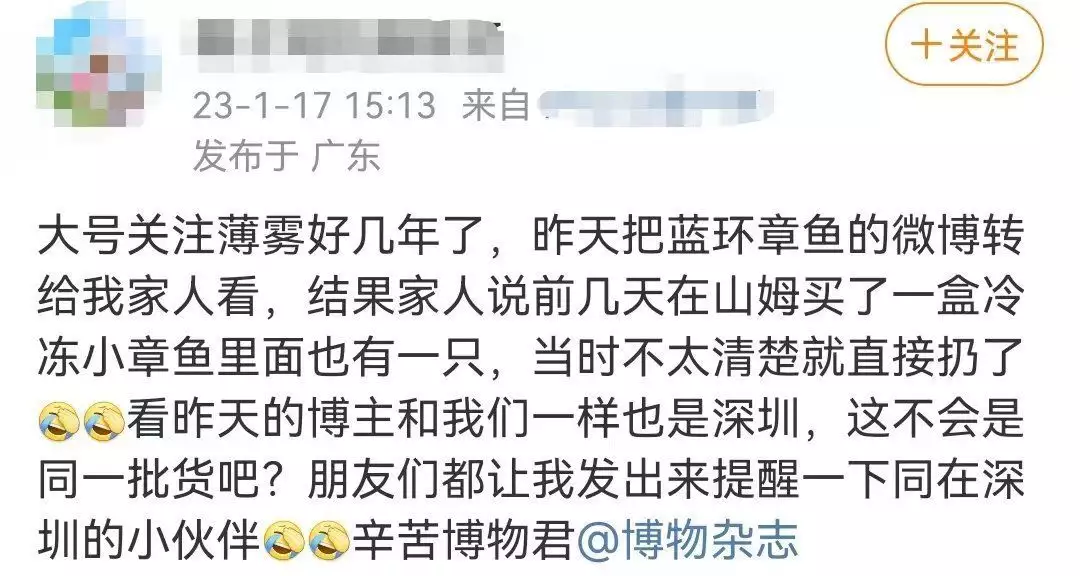 日前,一网友在火锅店菜品中发现蓝环章鱼,引发关注。1月17日,一位深圳的网友又发帖称,家人几日前曾在山姆福田店买了一盒冷冻小章鱼,打开发现里面有一只蓝环章鱼。