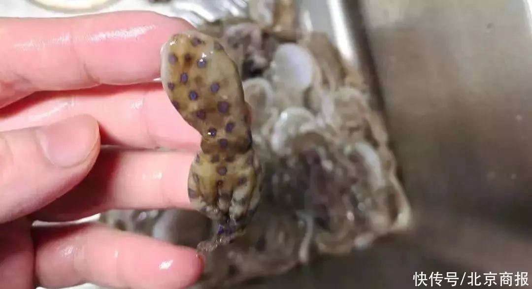 就在此前,一名网友在吃火锅时,发现菜品内有疑似蓝环章鱼物种,拍摄照片并询问科普博主@博物杂志,后经确认为蓝环章鱼,有剧毒。