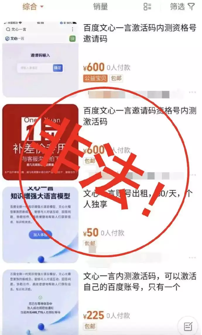 ( 百度 ) 近期,在个别电商、网络平台及社群中,出现贩卖百度文心一言内测激活码和账号牟利的情况。