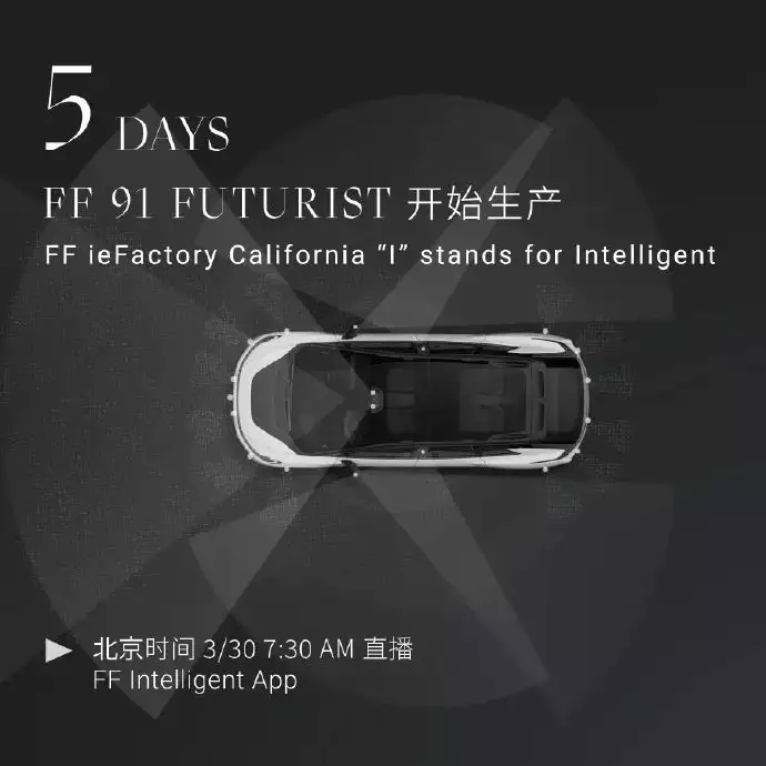 ( 快科技 )今日,贾跃亭在微博上宣布:“ 倒计时 5 天!我们即将开始生产( SOP )FF 91 Futurist,并交付给极具未来主义精神的全球塔尖用户。”