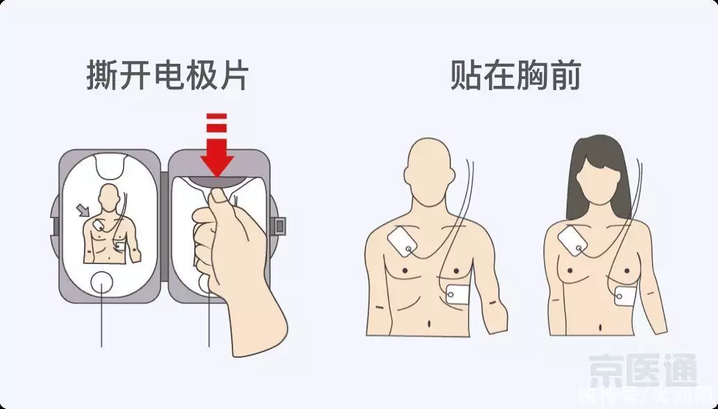根据语音提示,解开患者上衣,撕开“电极片”,按照图示贴在患者胸前。