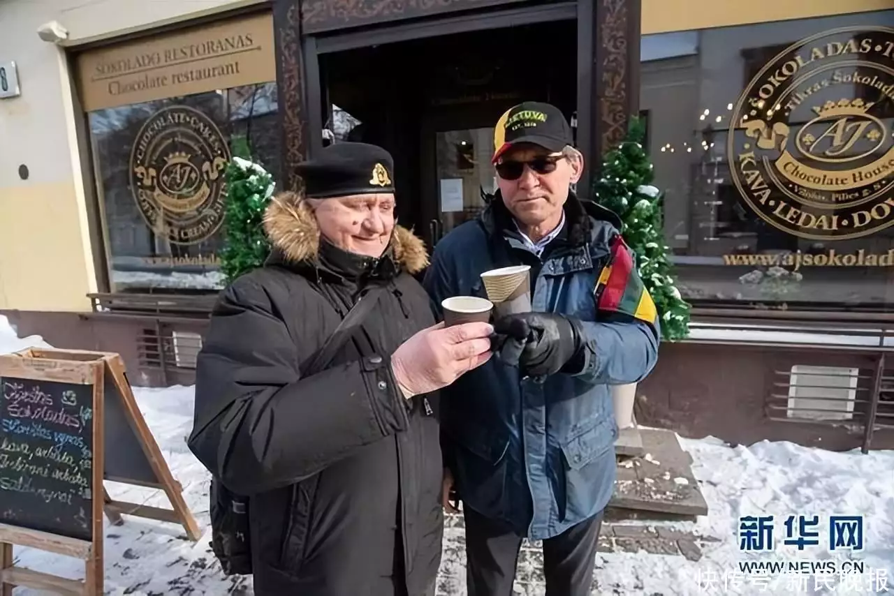 2021年2月16日,两名男子在立陶宛首都维尔纽斯老城庆祝独立日