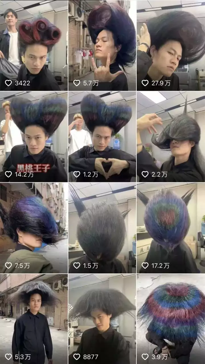 短视频的内容,一开始讲述个人经历和科普杀马特,到2022年,变成一套固定模式:配合电子舞曲,先展示一头清水挂面的湿发,接着,发型师一拉开围布,他变成另一个样子:顶着新创作的“炸裂”发型,命名为正人君子、一柱擎天,或者黑桃王子、蚌壳……接着,对着镜头摩挲头发,或是嘴唇。