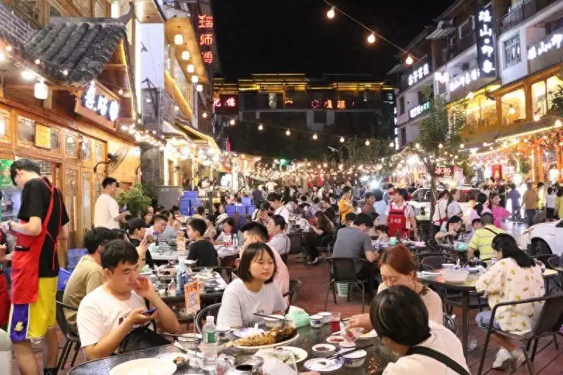 临近傍晚,餐饮店陆续迎来客流高峰,一些口碑美食店和特色老店尤其受欢迎。“下午6点半到8点半人气最旺,一天客流源源不断,今天就接待游客量近1400人。”笔者来到小七孔景区东门旁的瑶厨看到,饭店负责人覃优正忙着招呼客人就座,走进饭店,只见桌桌满客,服务员们忙得不亦乐乎。