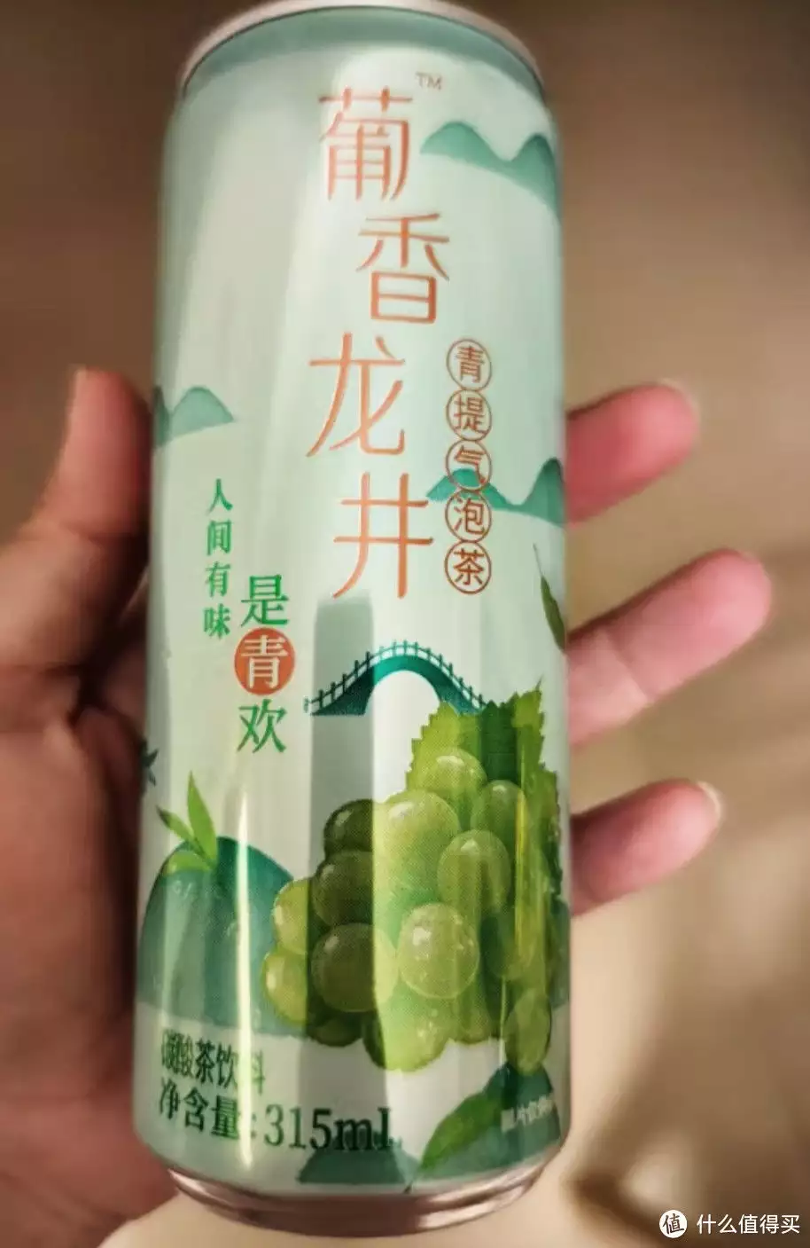 包装设计:金属罐装,开启非常方便,正面是商品名称【葡香龙井】,左侧有一句很有韵味的广告词:人间有味是清欢。底下是青提图案,在龙井茶叶的背景映衬下,毫无违和感。最下方标注了“碳酸茶饮料”的字样,一罐315ml。 试喝体验:拧开瓶盖,立刻被葡香龙井青提气泡茶的诱人香气所包围。轻抿一口,会感受到一种独特的饮用体验,茶在口中慢慢地释放着淡淡的芳香。经过精心的处理和原叶萃取,保留了其独特的香气和口感。每一口都是一段旅程,带你走进气泡茶的奇妙之旅,感受自然的香气,与大自然和谐相融。
