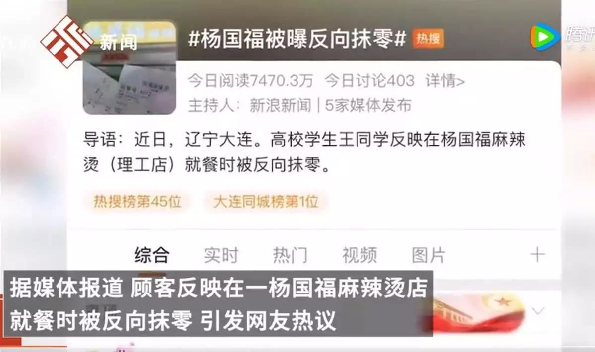 近日,辽宁大连。一高校学生王同学反映在杨国福麻辣烫就餐时被反向抹零,一碗麻辣烫20.35元被收取了20.4元,另一碗16.47元被收取了16.5元。12月9日,大连市高新区市监局回应称,已对涉事门店立案查处,但该店早已退出杨国福加盟。(据12月9日九派新闻)