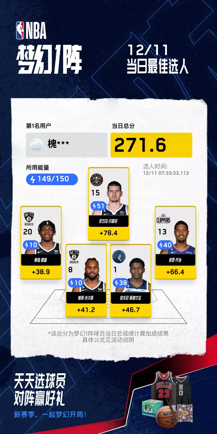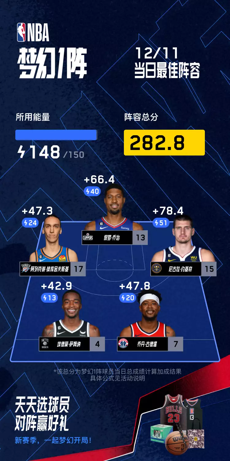 点评:押宝约老师+乔大将军稳获基本盘,再加上两位仅需10能量值的超值球员米尔斯和夏普加持,今日榜一非你莫属!