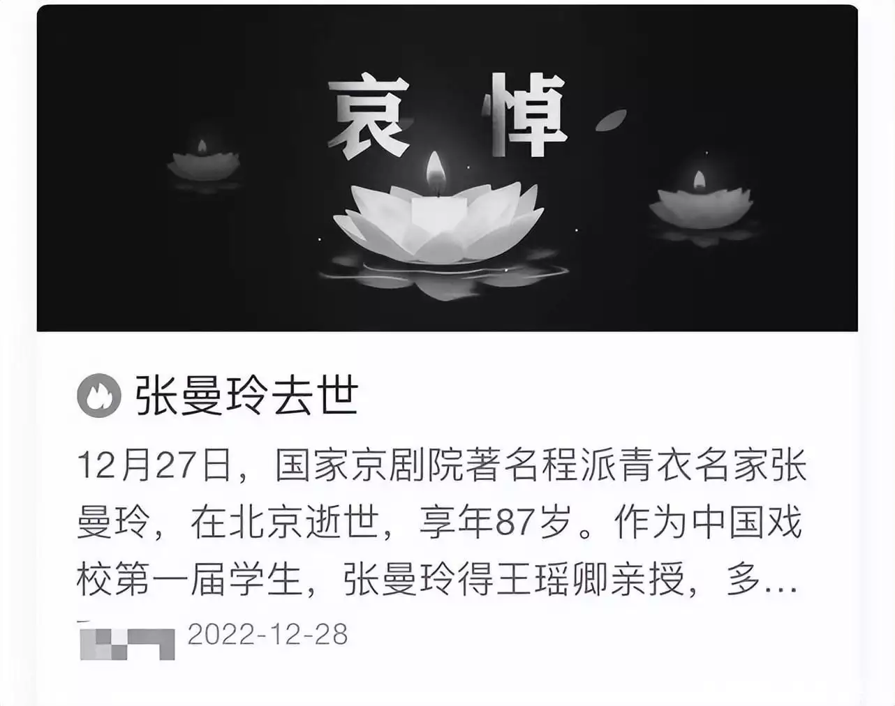 12月28日,有媒体报道国家京剧院著名程派青衣名家张曼玲,于12月27日在北京逝世,享年87岁。