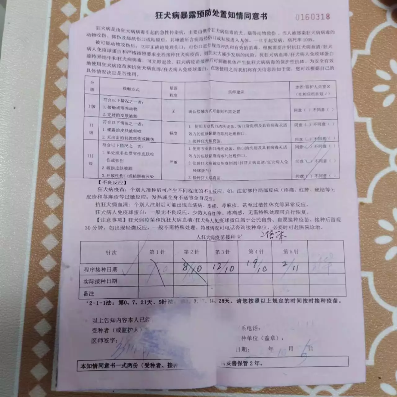 孩子被咬伤后,潘先生立刻带着孩子来到经开区临湖新年社区卫生服务站进行治疗。潘先生告诉记者,送到卫生站后第一时间就打了破伤风和狂犬疫苗。“当天下午就打了五、六针,每隔半小时就要观察一下继续打针,一直持续到傍晚。”潘先生告诉大皖新闻记者,当时医生看到孩子的伤口还说这是三级伤害,属于狂犬病暴露分级中最严重的一级。