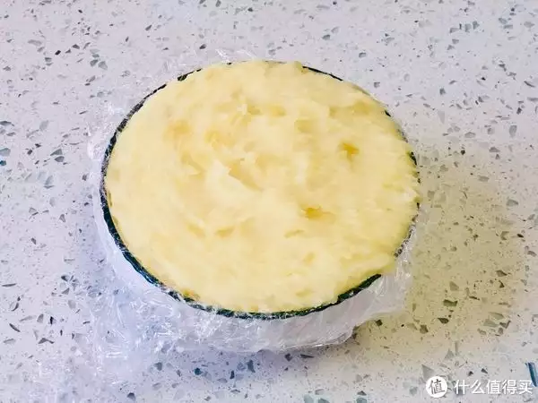 为了更加美观,我们可以做一个造型,取一个碗,碗里铺上一层保鲜膜,然后把土豆泥倒入碗中,按压瓷实,取一个盘子,把碗扣在上边,揭掉保鲜膜,就能得到一个圆滚滚的土豆泥了。