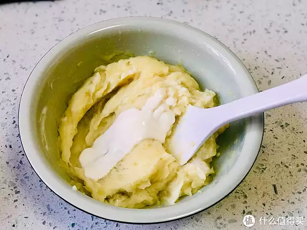 接下来我们往土豆泥里边加入适当的酸奶,不喜欢酸奶的,加纯奶也可以,然后搅拌均匀,让酸奶和土豆泥完全融合在一起。