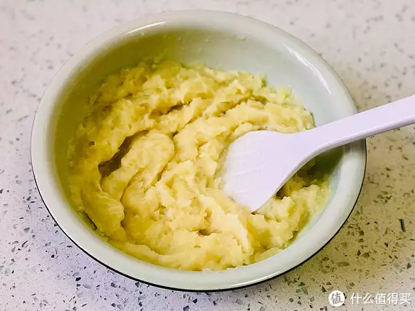 土豆片蒸熟之后,放置常温下自然晾凉,然后把土豆片倒入盆子里边,有铲子压成土豆泥。