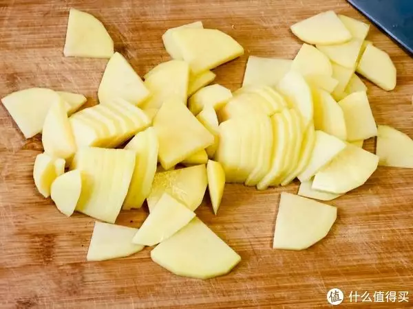 荷兰土豆清洗干净外边的泥土,削掉外边的土豆皮,改刀切成片,土豆片不要切得太厚了,否则蒸的时候费时间。