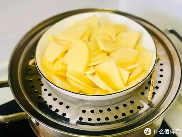 切好的土豆片无需淘洗,直接装在盘子里边,冷水上锅蒸,水开之后蒸上15分钟,把土豆片完全蒸透。